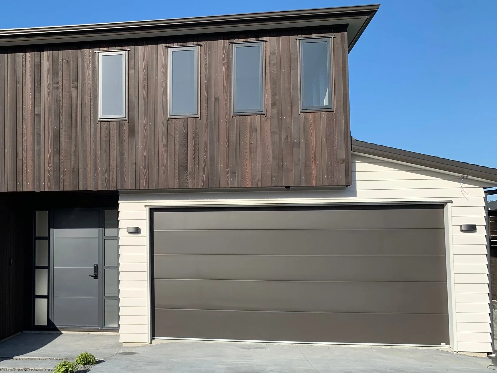 Flat panel door system, the ultimate slick in finishes for that clean yet sophisticated style. Ideal choice for modern homes with minimalistic design providing a sharp-witted impression to its spectator. High R13 rated insulation shielding from the harsh New Zealand environment. Double skinned polyurethane insulation system keeping both heat and cold out, at the same time reduce everyday noise. PPG automotive colour system giving your door the same durability as your car. Nylon bushing implemented on all axles and wheels combining with the quietest belt driven motor on the market giving you the optimal quietness while operating.